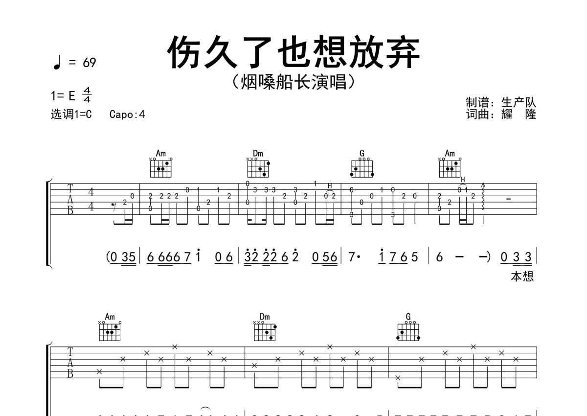 《伤久了也想放弃》是烟嗓船长演唱的一首歌曲,精编完美版,拍号为4/4拍,歌曲速度为每分钟69拍,歌曲原调为E调,但由于原调指法比较难,为了方便弹奏,本吉他谱采用的是C调指法编配,变调夹4品弹奏即为原调,当然也可以根据自己的音域改变变调夹位置,或者通过改变和弦调性,以方便自己弹奏,这份吉他谱共有两张高清图谱,图谱由 @生产队 编配上传,图谱使用六线谱编配,包含吉他和弦指法、简谱以及歌词部分,使用这份伤久了也想放弃吉他谱,可以让你更加方便地掌握这首歌曲的弹唱技巧,快来尝试吧。烟嗓船长演唱的歌曲《伤久了也想放弃》原版吉他谱,含精准的前奏、间奏、尾奏solo编配,精编完美版,优质推荐!。