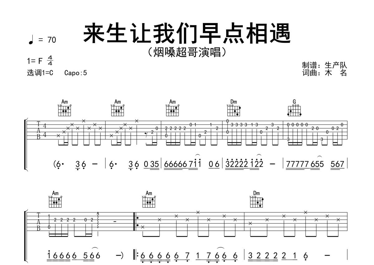 烟嗓超哥《来生让我们早点相遇》吉他谱 - C调弹唱六线谱 - 精编完美版