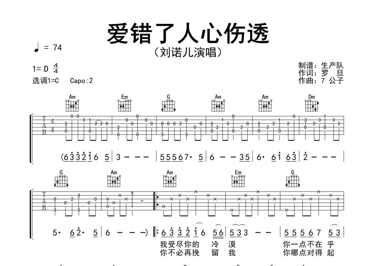 《爱错了人心伤透》是刘诺儿演唱的一首歌曲,精编完美版,拍号为4/4拍,歌曲速度为每分钟74拍,歌曲原调为D调,但由于原调指法比较难,为了方便弹奏,本吉他谱采用的是C调指法编配,变调夹2品弹奏即为原调,当然也可以根据自己的音域改变变调夹位置,或者通过改变和弦调性,以方便自己弹奏,这份吉他谱共有两张高清图谱,图谱由 @生产队 编配上传,图谱使用六线谱编配,包含吉他和弦指法、简谱以及歌词部分,使用这份爱错了人心伤透吉他谱,可以让你更加方便地掌握这首歌曲的弹唱技巧,快来尝试吧。刘诺儿演唱的歌曲《爱错了人心伤透》原版吉他谱,含精准的前奏、间奏、尾奏solo编配,精编完美版,优质推荐!。