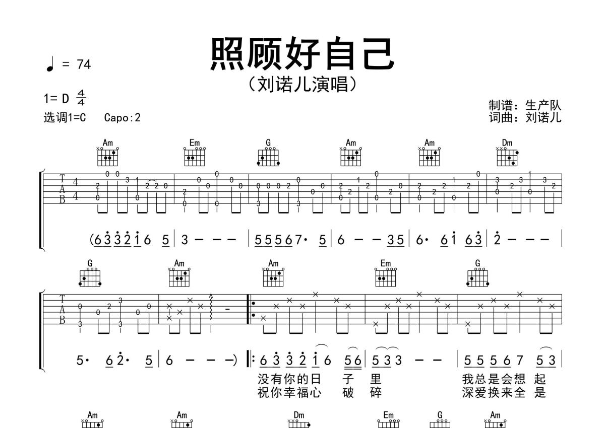 《照顾好自己》是刘诺儿演唱的一首歌曲,精编完美版,拍号为4/4拍,歌曲速度为每分钟74拍,歌曲原调为D调,但由于原调指法比较难,为了方便弹奏,本吉他谱采用的是C调指法编配,变调夹2品弹奏即为原调,当然也可以根据自己的音域改变变调夹位置,或者通过改变和弦调性,以方便自己弹奏,这份吉他谱共有两张高清图谱,图谱由 @生产队 编配上传,图谱使用六线谱编配,包含吉他和弦指法、简谱以及歌词部分,使用这份照顾好自己吉他谱,可以让你更加方便地掌握这首歌曲的弹唱技巧,快来尝试吧。刘诺儿演唱的歌曲《照顾好自己》原版吉他谱,含精准的前奏、间奏、尾奏solo编配,精编完美版,优质推荐!。