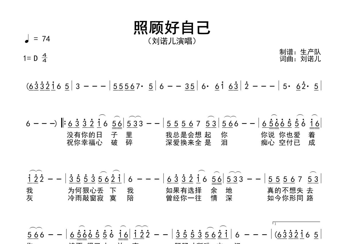 《照顾好自己》是刘诺儿演唱的一首歌曲,原版简谱,拍号为4/4拍,歌曲速度为每分钟74拍,这份简谱共有一张高清图谱,图谱由 @生产队 编配上传刘诺儿演唱的歌曲《照顾好自己》原版简谱,含精准的前奏、间奏、尾奏solo编配,精编完美版,优质推荐!。