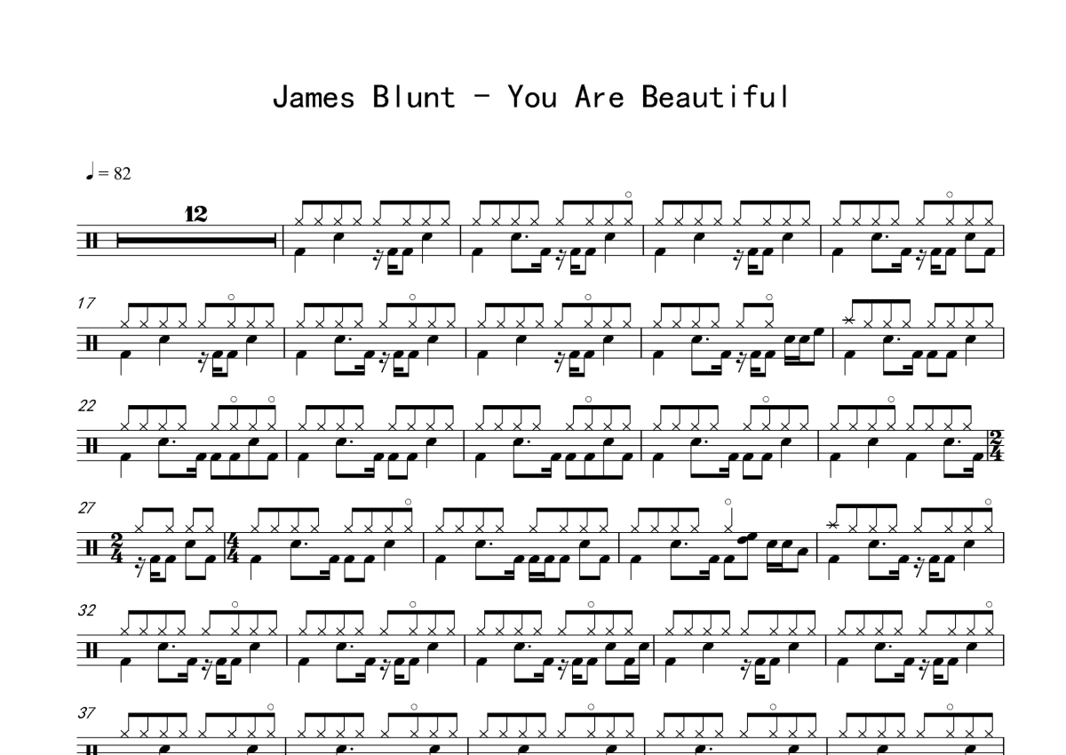 《You Are Beautiful》是James Blunt演唱的一首歌曲,拍号为4/4拍,歌曲速度为每分钟82拍,这份架子鼓谱共有一张高清图谱,图谱由 @音符喷血者 编配上传,图谱使用五线谱编配,使用这份You Are Beautiful架子鼓谱,你将能够轻松地敲打出这首James Blunt的You Are Beautiful,快来尝试吧。