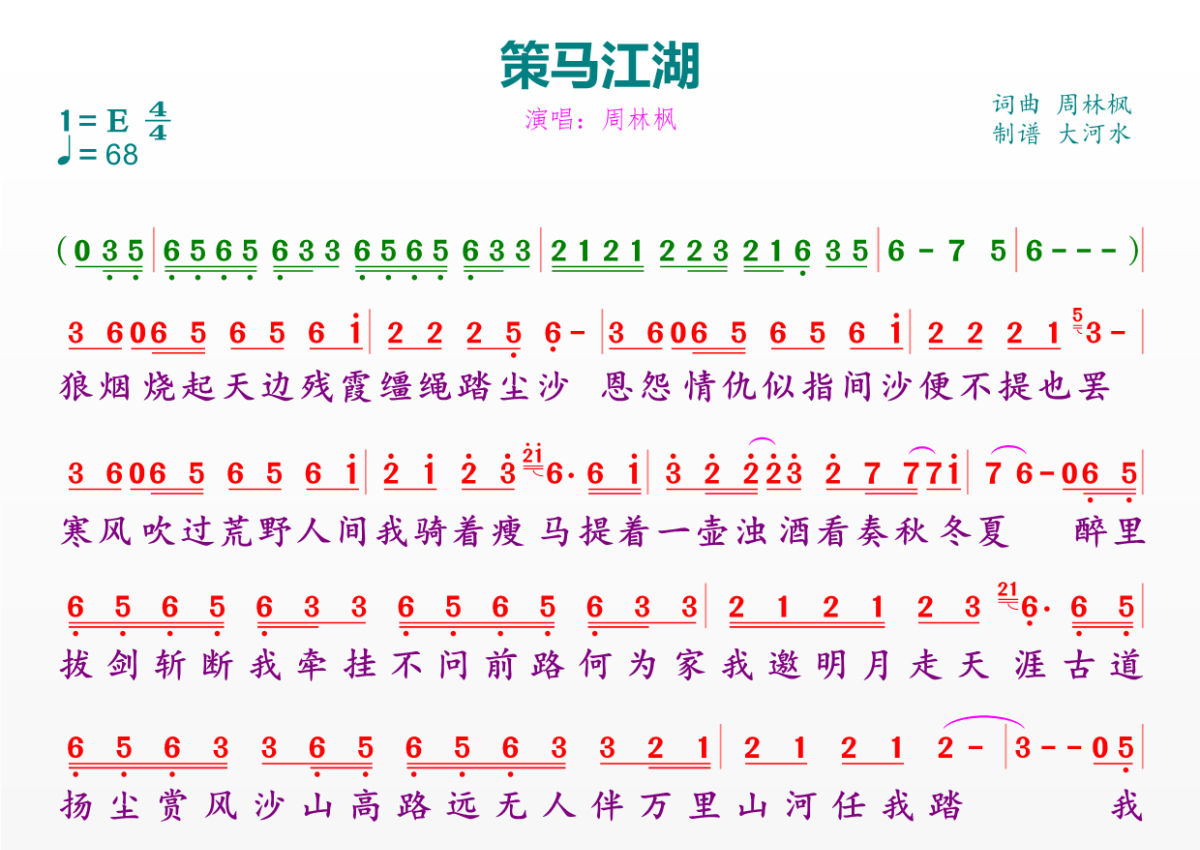 《策马江湖》是周林枫演唱的一首歌曲,拍号为4/4拍,歌曲速度为每分钟68拍,这份简谱共有一张高清图谱,图谱由 @临海雪原 编配上传。