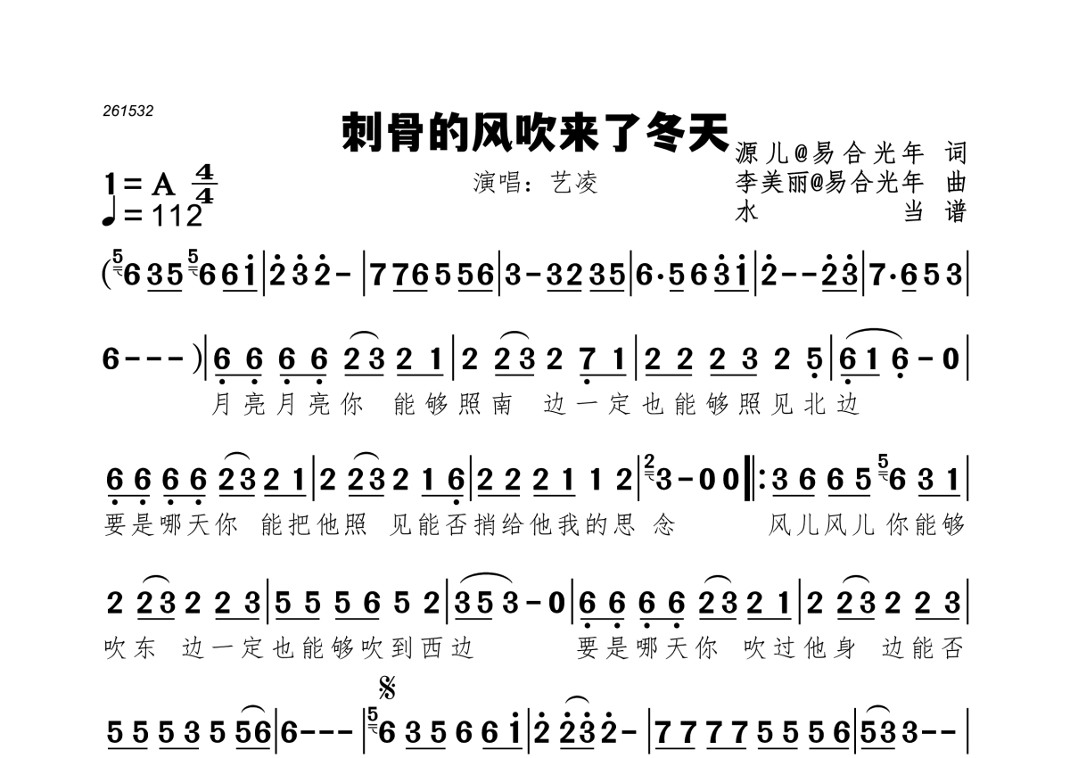《刺骨的风吹来了冬天》是艺凌演唱的一首歌曲,拍号为4/4拍,歌曲速度为每分钟112拍,这份简谱共有一张高清图谱,图谱由 @水当 编配上传。