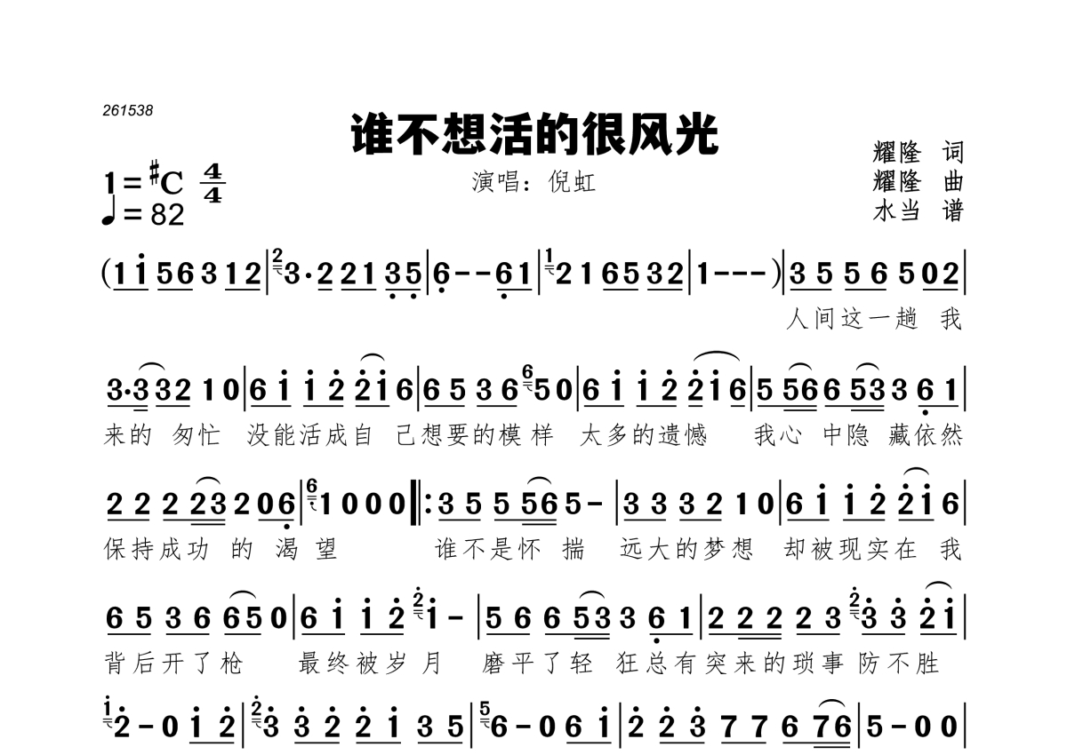 《谁不想活的很风光》是倪虹演唱的一首歌曲,拍号为4/4拍,歌曲速度为每分钟82拍,这份简谱共有一张高清图谱,图谱由 @水当 编配上传。