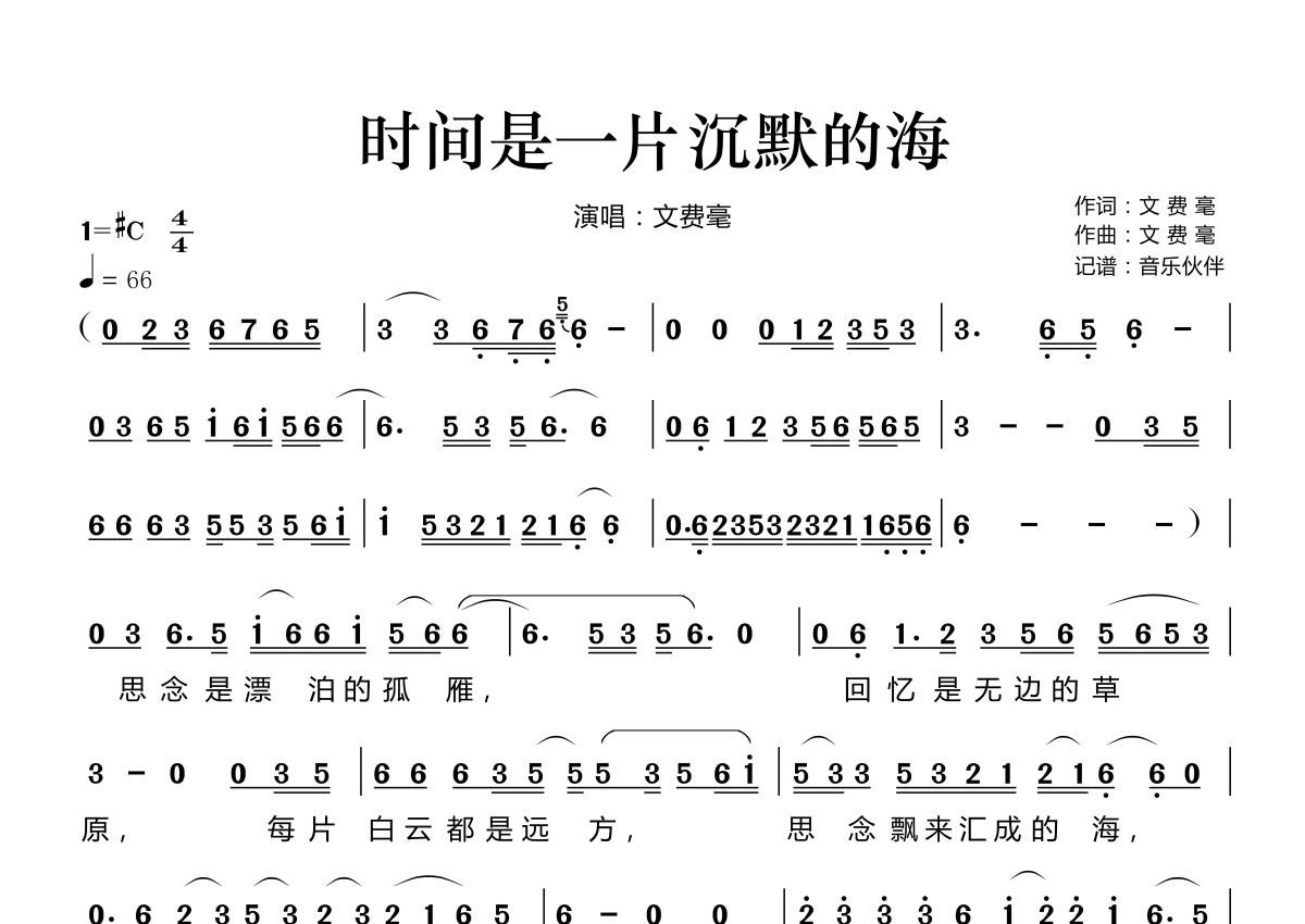 《时间是一片沉默的海》是文费毫演唱的一首歌曲,拍号为4/4拍,歌曲速度为每分钟66拍,这份简谱共有两张高清图谱,图谱由 @音乐伙伴 编配上传。