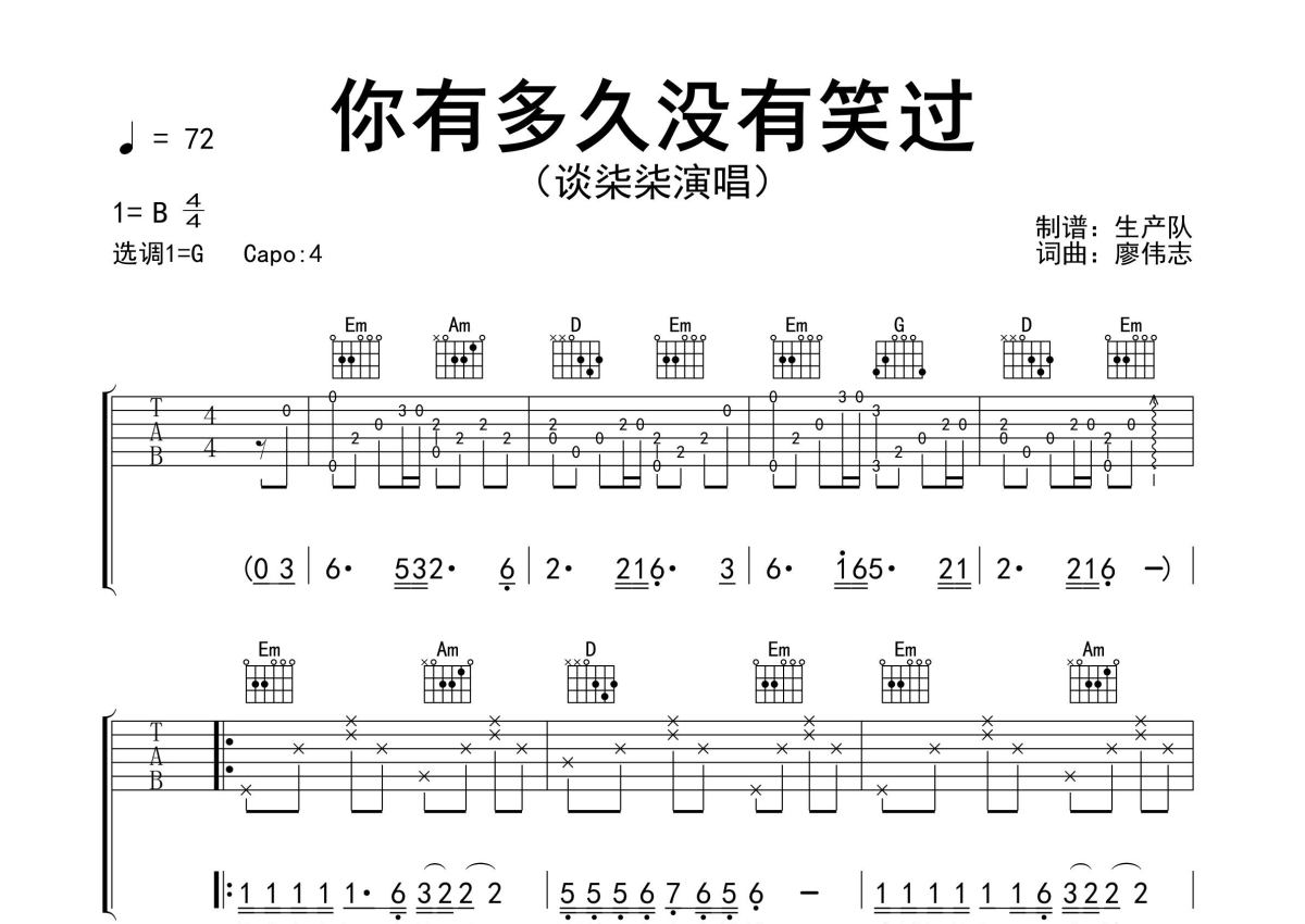 《你有多久没有笑过》是谈柒柒演唱的一首歌曲,精编完美版,拍号为4/4拍,歌曲速度为每分钟72拍,歌曲原调为B调,但由于原调指法比较难,为了方便弹奏,本吉他谱采用的是G调指法编配,变调夹4品弹奏即为原调,当然也可以根据自己的音域改变变调夹位置,或者通过改变和弦调性,以方便自己弹奏,这份吉他谱共有三张高清图谱,图谱由 @生产队 编配上传,图谱使用六线谱编配,包含吉他和弦指法、简谱以及歌词部分,使用这份你有多久没有笑过吉他谱,可以让你更加方便地掌握这首歌曲的弹唱技巧,快来尝试吧。谈柒柒演唱的歌曲《你有多久没有笑过》原版吉他谱,含精准的前奏、间奏、尾奏solo编配,精编完美版,优质推荐!。