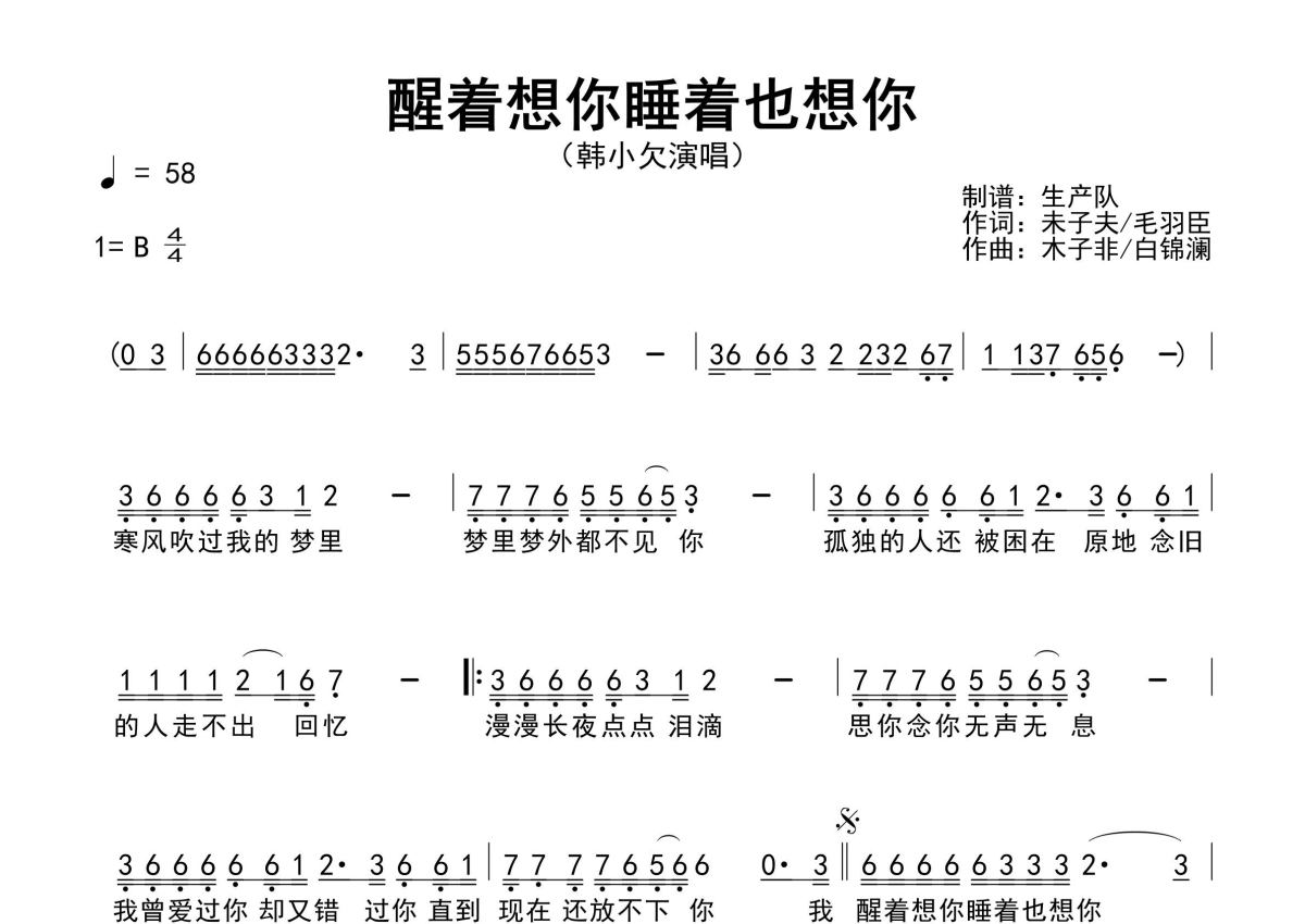 《醒着想你睡着也想你》是韩小欠演唱的一首歌曲,原版简谱,拍号为4/4拍,歌曲速度为每分钟58拍,这份简谱共有一张高清图谱,图谱由 @生产队 编配上传韩小欠演唱的歌曲《醒着想你睡着也想你》原版简谱,含精准的前奏、间奏、尾奏solo编配,精编完美版,优质推荐!。