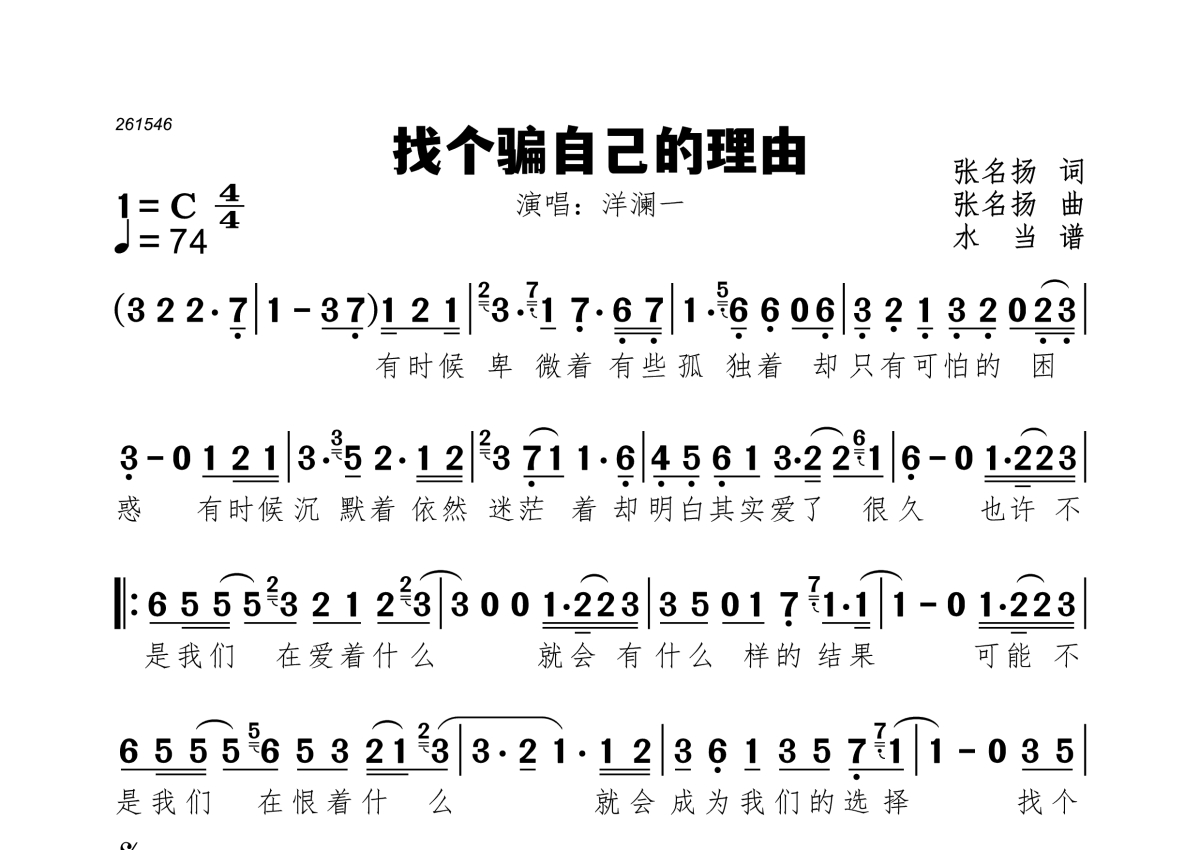 《找个骗自己的理由》是洋澜一演唱的一首歌曲,拍号为4/4拍,歌曲速度为每分钟74拍,这份简谱共有一张高清图谱,图谱由 @水当 编配上传。