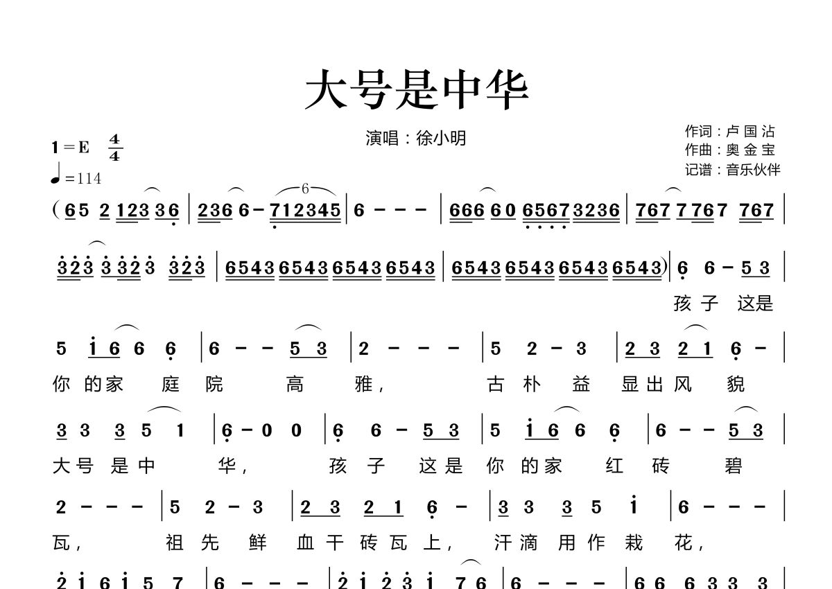 《大号是中华》是徐小明演唱的一首歌曲,拍号为4/4拍,歌曲速度为每分钟114拍,这份简谱共有一张高清图谱,图谱由 @音乐伙伴 编配上传。