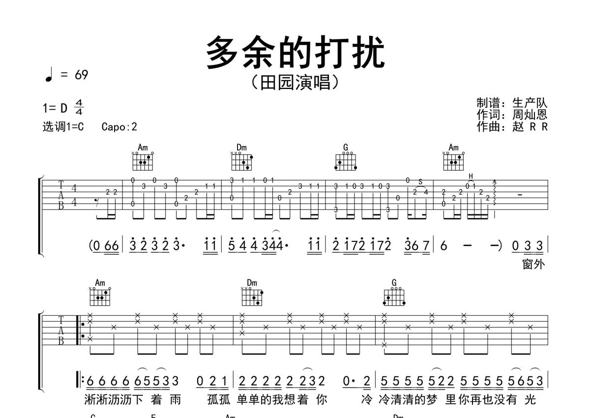 《多余的打扰》是田园演唱的一首歌曲,精编完美版,拍号为4/4拍,歌曲速度为每分钟69拍,歌曲原调为D调,但由于原调指法比较难,为了方便弹奏,本吉他谱采用的是C调指法编配,变调夹2品弹奏即为原调,当然也可以根据自己的音域改变变调夹位置,或者通过改变和弦调性,以方便自己弹奏,这份吉他谱共有两张高清图谱,图谱由 @生产队 编配上传,图谱使用六线谱编配,包含吉他和弦指法、简谱以及歌词部分,使用这份多余的打扰吉他谱,可以让你更加方便地掌握这首歌曲的弹唱技巧,快来尝试吧。田园演唱的歌曲《多余的打扰》原版吉他谱,含精准的前奏、间奏solo编配,精编完美版,优质推荐!。