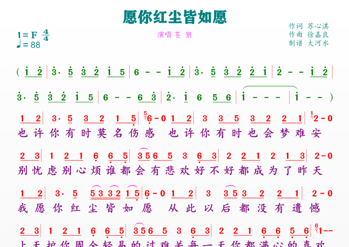 《愿你红尘皆如愿》是苍狼演唱的一首歌曲,拍号为4/4拍,歌曲速度为每分钟88拍,这份简谱共有一张高清图谱,图谱由 @临海雪原 编配上传。
