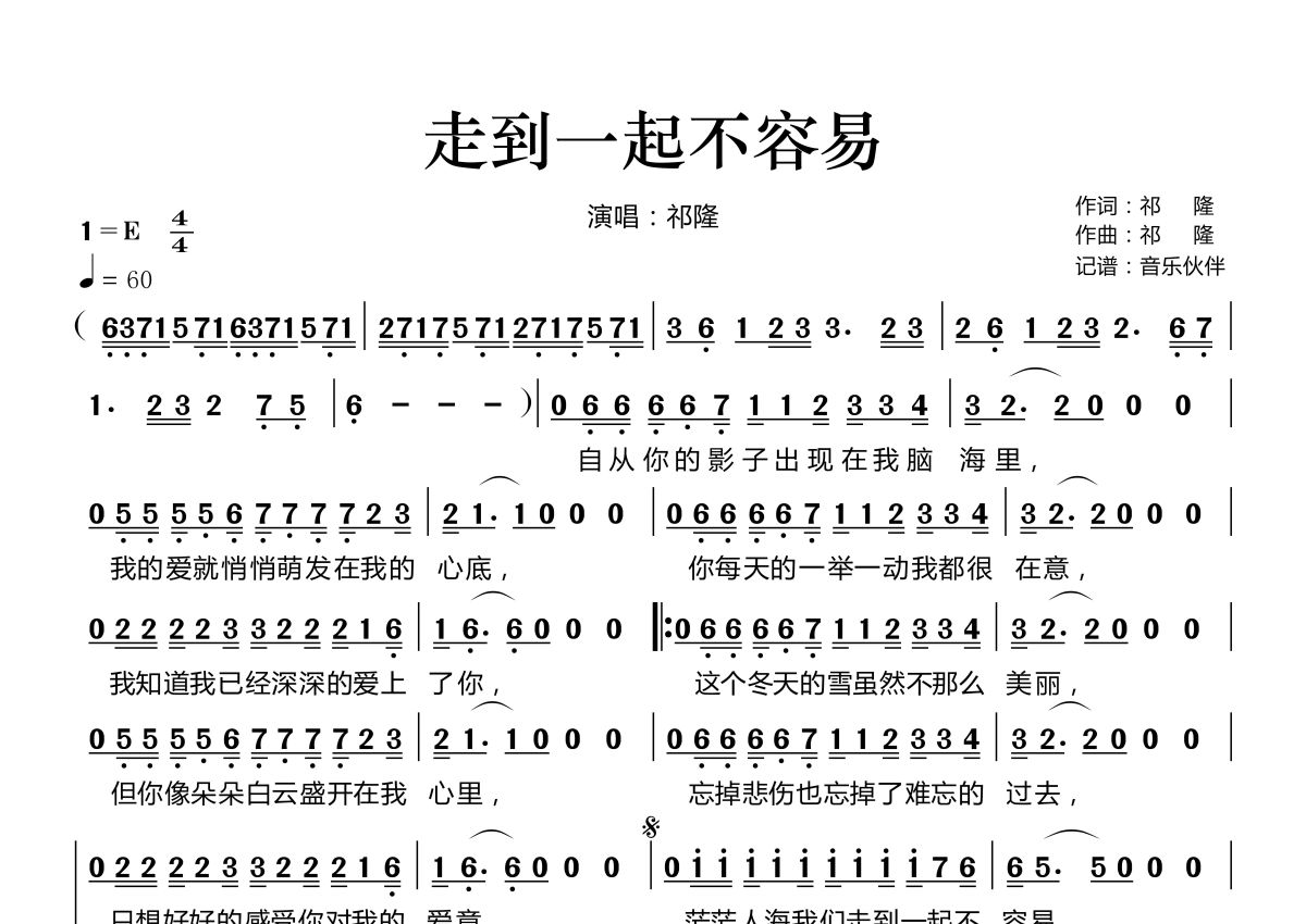 《走到一起不容易》是祁隆演唱的一首歌曲,拍号为4/4拍,歌曲速度为每分钟60拍,这份简谱共有一张高清图谱,图谱由 @音乐伙伴 编配上传。