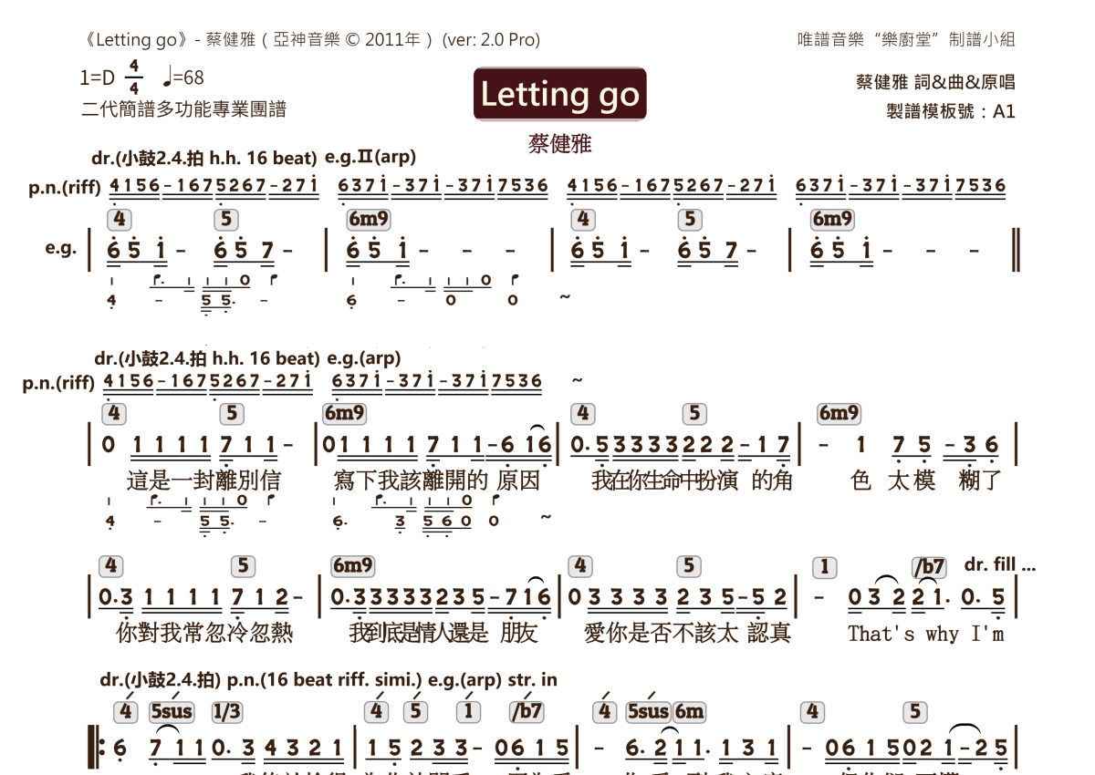 蔡健雅《Letting Go》乐队总谱 - 2.0版多功能团谱
