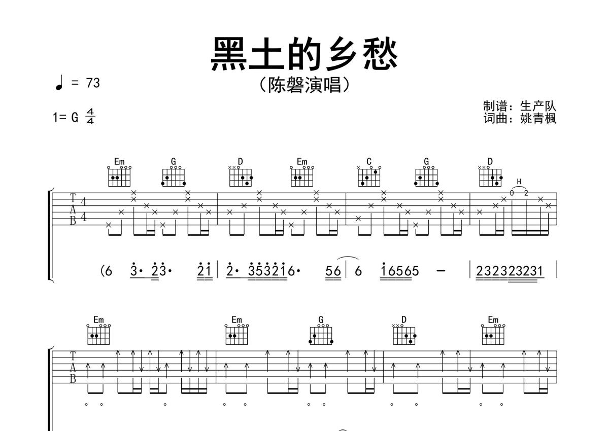 《黑土的乡愁》是陈磐演唱的一首歌曲,精编完美版,拍号为4/4拍,歌曲速度为每分钟73拍,歌曲原调为G调,本吉他谱采用的是G调指法编配,演奏时不需要使用变调夹即为原调,这份吉他谱共有三张高清图谱,图谱由 @生产队 编配上传,图谱使用六线谱编配,包含吉他和弦指法、简谱以及歌词部分,使用这份黑土的乡愁吉他谱,可以让你更加方便地掌握这首歌曲的弹唱技巧,快来尝试吧。陈磐演唱的歌曲《黑土的乡愁》原版吉他谱,含精准的前奏、间奏、尾奏solo编配,精编完美版,优质推荐!。