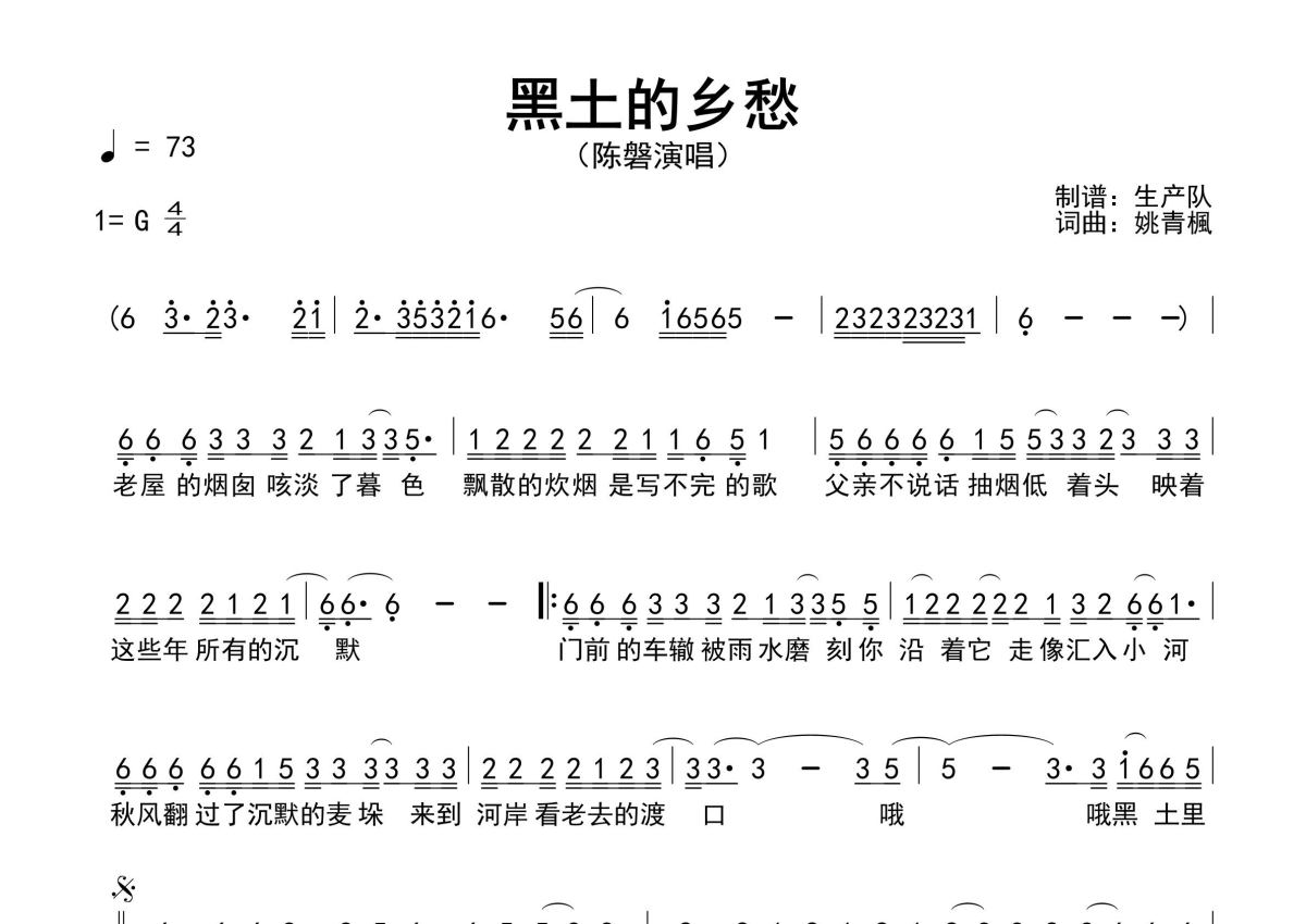 《黑土的乡愁》是陈磐演唱的一首歌曲,原版简谱,拍号为4/4拍,歌曲速度为每分钟73拍,这份简谱共有一张高清图谱,图谱由 @生产队 编配上传陈磐演唱的歌曲《黑土的乡愁》原版简谱,含精准的前奏、间奏、尾奏solo编配,精编完美版,优质推荐!。