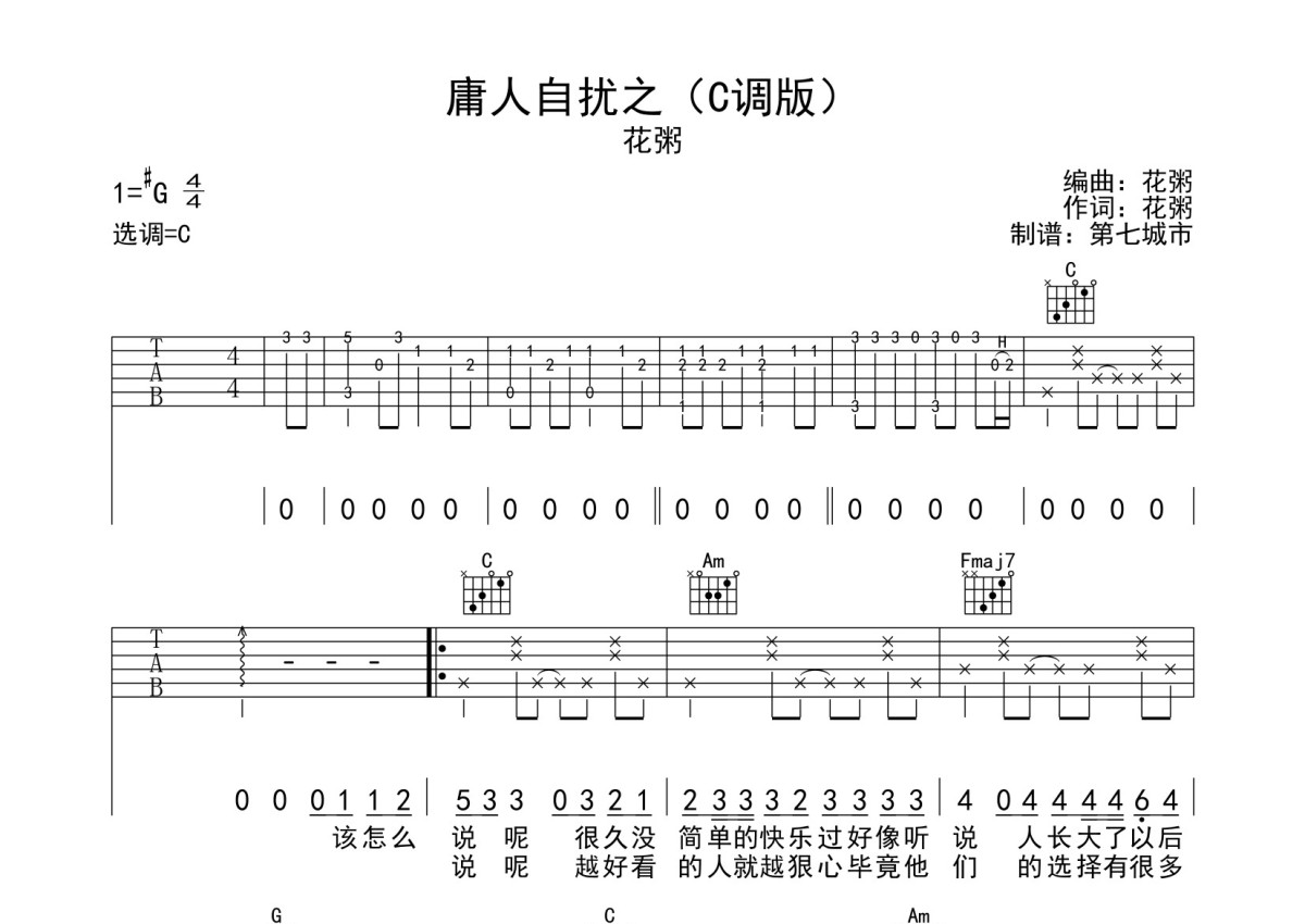 花粥《庸人自扰之》吉他谱 - C调弹唱六线谱