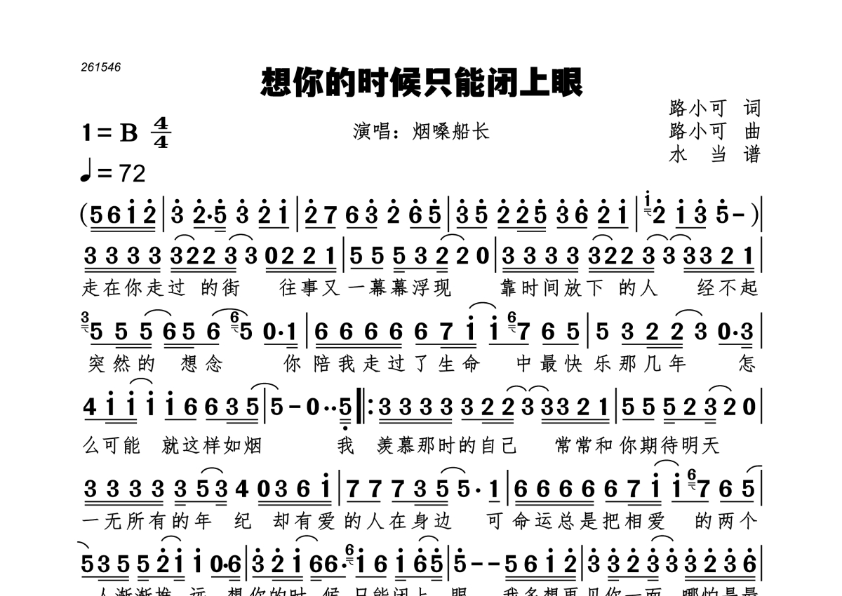 《想你的时候只能闭上眼》是烟嗓船长演唱的一首歌曲,拍号为4/4拍,歌曲速度为每分钟72拍,这份简谱共有一张高清图谱,图谱由 @水当 编配上传。