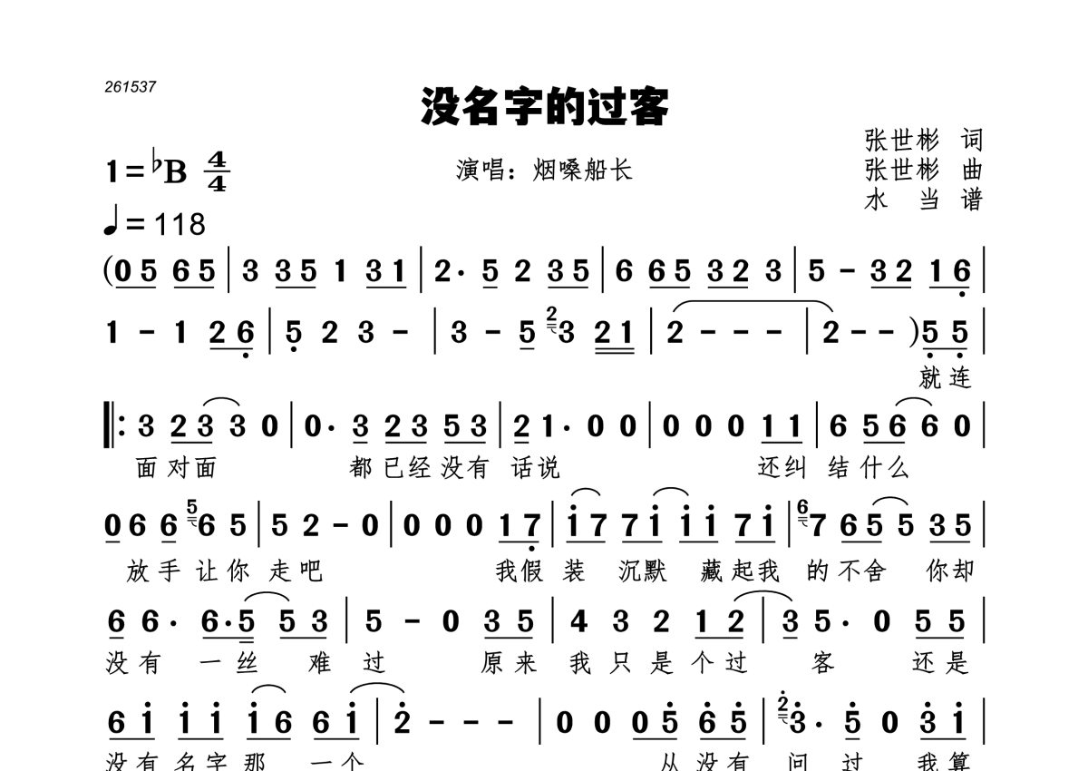 没名字的过客简谱 - 烟嗓船长演唱