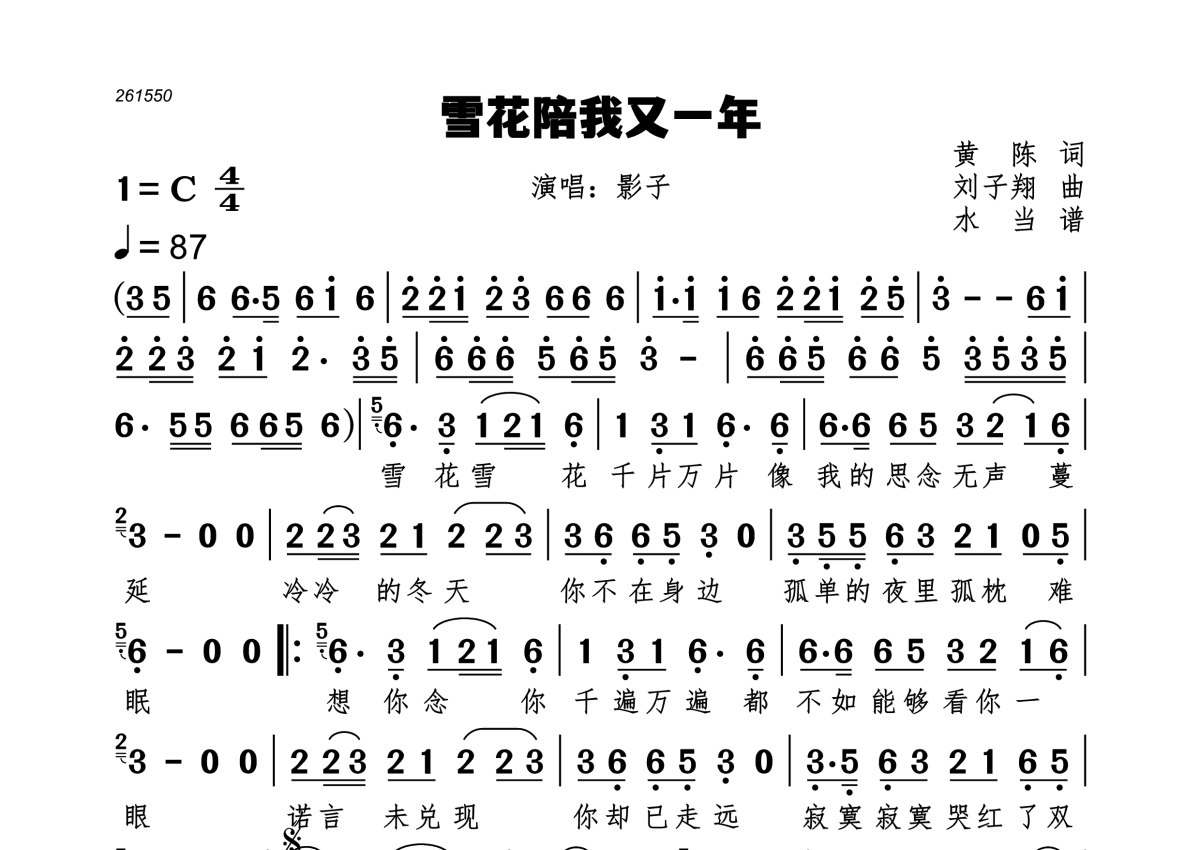 《雪花陪我又一年》是影子演唱的一首歌曲,拍号为4/4拍,歌曲速度为每分钟87拍,这份简谱共有一张高清图谱,图谱由 @水当 编配上传。