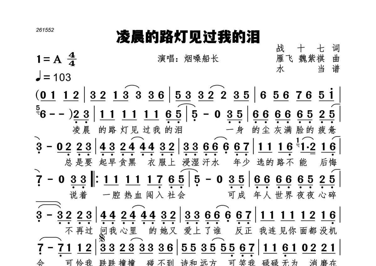 《凌晨的路灯见过我的泪》是烟嗓船长演唱的一首歌曲,拍号为4/4拍,歌曲速度为每分钟103拍,这份简谱共有一张高清图谱,图谱由 @水当 编配上传。