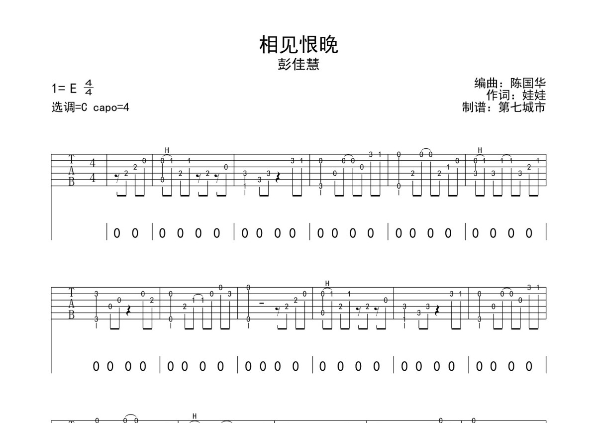 《相见恨晚》是彭佳慧演唱的一首歌曲,本吉他谱采用的是C调指法编配,这份吉他谱共有三张高清图谱,图谱由 @第七城市 编配上传,图谱使用六线谱编配,包含吉他和弦指法、简谱以及歌词部分,曲谱配备了相关的音频提供试听,使用这份相见恨晚吉他谱,可以让你更加方便地掌握这首歌曲的弹唱技巧,快来尝试吧。彭佳慧《相见恨晚》吉他弹唱谱,采用E调指法编配,第七城市编配出品,共有3张高清图谱。