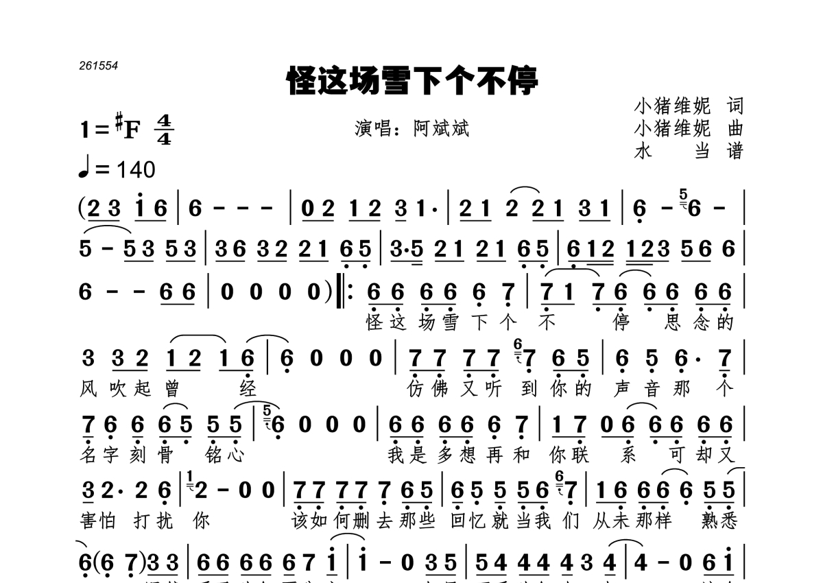 《怪这场雪下个不停》是阿斌斌演唱的一首歌曲,拍号为4/4拍,歌曲速度为每分钟140拍,这份简谱共有一张高清图谱,图谱由 @水当 编配上传。