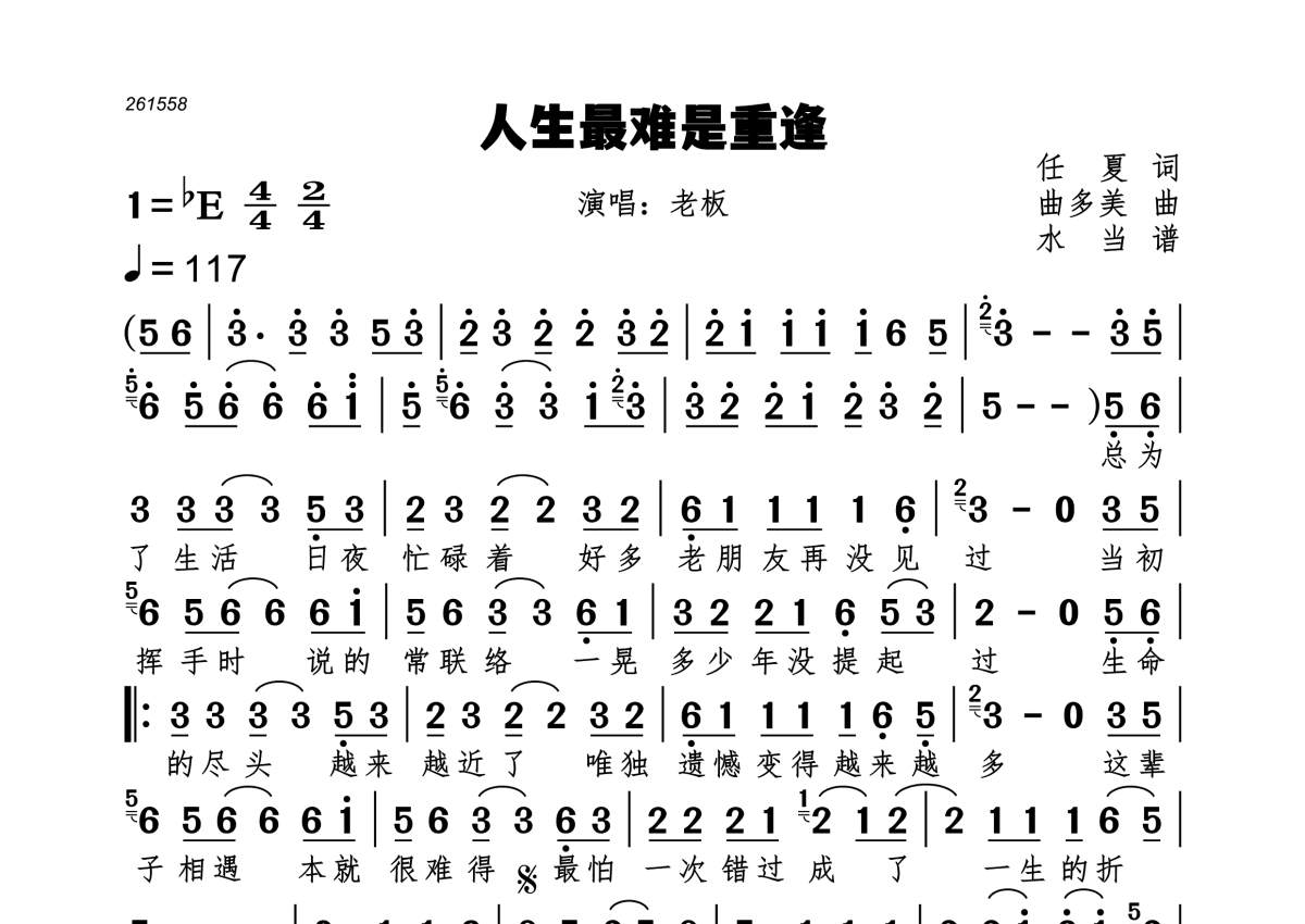 《人生最难是重逢》是老板演唱的一首歌曲,拍号为4/4拍,歌曲速度为每分钟117拍,这份简谱共有一张高清图谱,图谱由 @水当 编配上传。