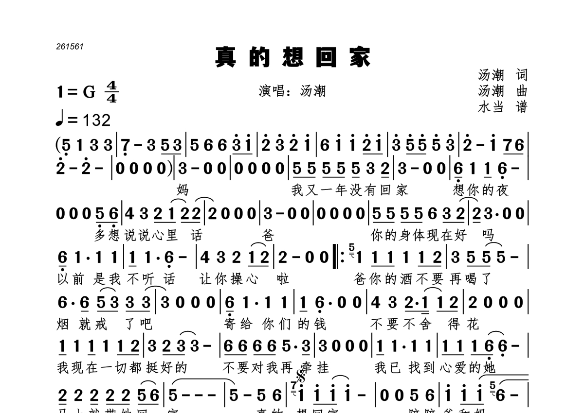 真的想回家简谱 - 汤潮演唱