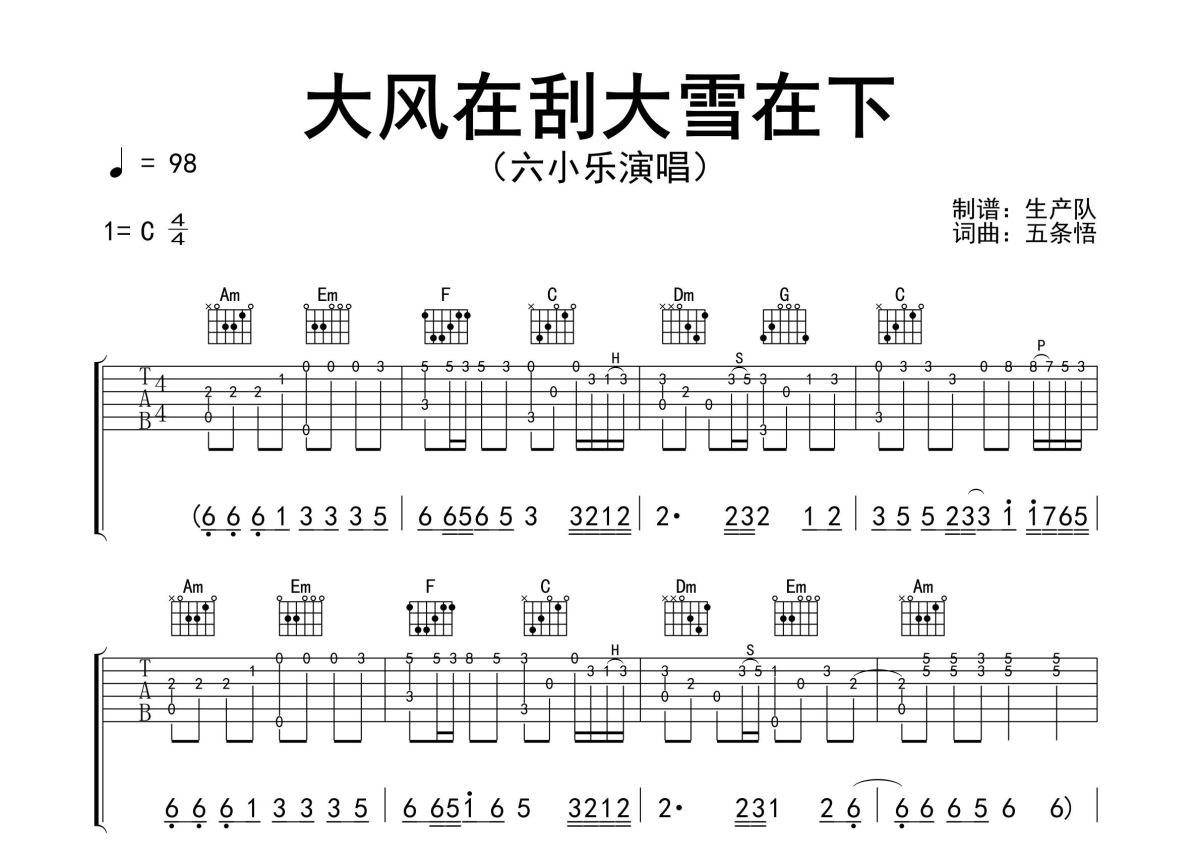 六小乐《大风在刮大雪在下》吉他谱 - C调弹唱六线谱 - 精编完美版
