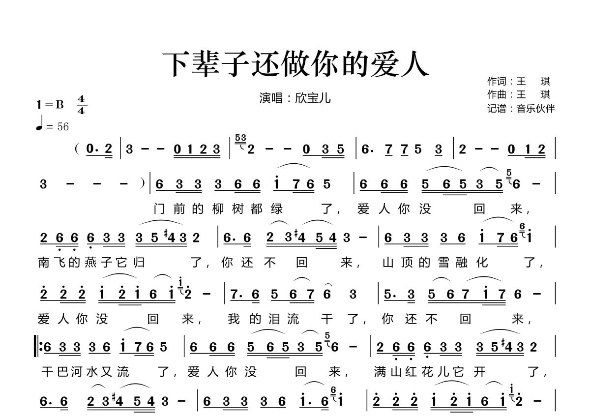 《下辈子还做你的爱人》是欣宝儿演唱的一首歌曲,拍号为4/4拍,歌曲速度为每分钟56拍,这份简谱共有一张高清图谱,图谱由 @音乐伙伴 编配上传。