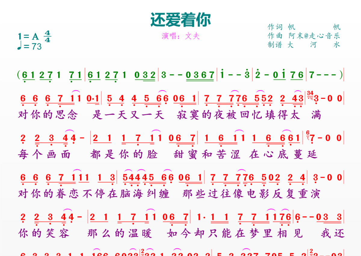 《还爱着你》是文夫演唱的一首歌曲,拍号为4/4拍,歌曲速度为每分钟73拍,这份简谱共有一张高清图谱,图谱由 @临海雪原 编配上传。