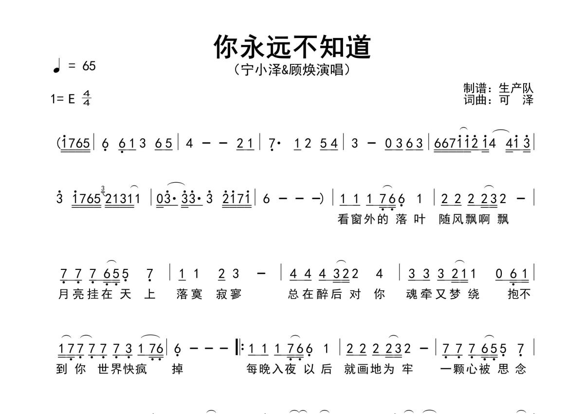 《你永远不知道》是宁小泽演唱的一首歌曲,原版简谱,拍号为4/4拍,歌曲速度为每分钟65拍,这份简谱共有一张高清图谱,图谱由 @生产队 编配上传宁小泽演唱的歌曲《你永远不知道》原版简谱,含精准的前奏、间奏solo编配,精编完美版,优质推荐!。