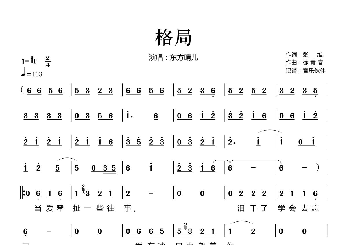 《格局》是东方晴儿演唱的一首歌曲,拍号为2/4拍,歌曲速度为每分钟103拍,这份简谱共有两张高清图谱,图谱由 @音乐伙伴 编配上传。