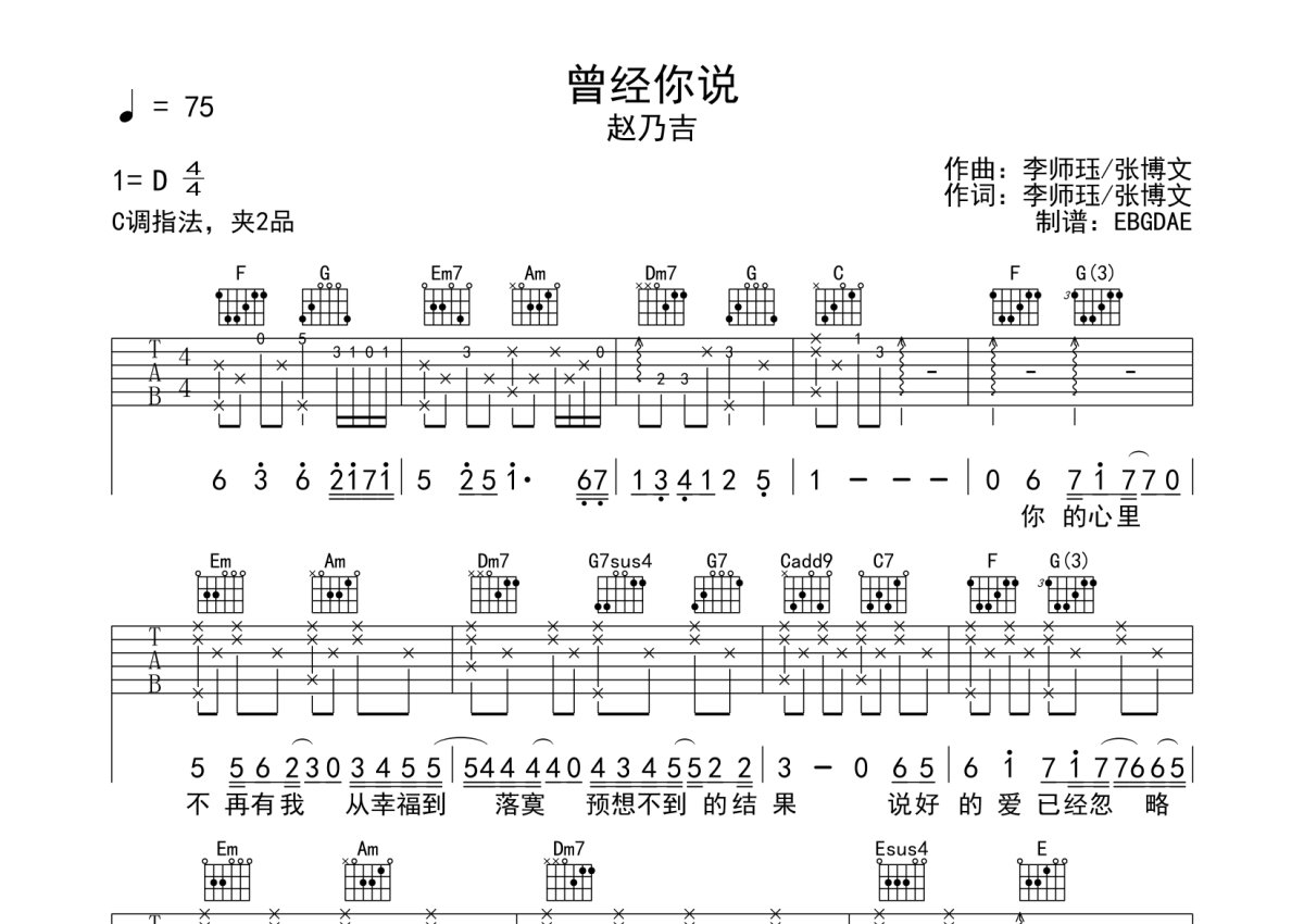 赵乃吉《曾经你说》吉他谱 - C调弹唱六线谱