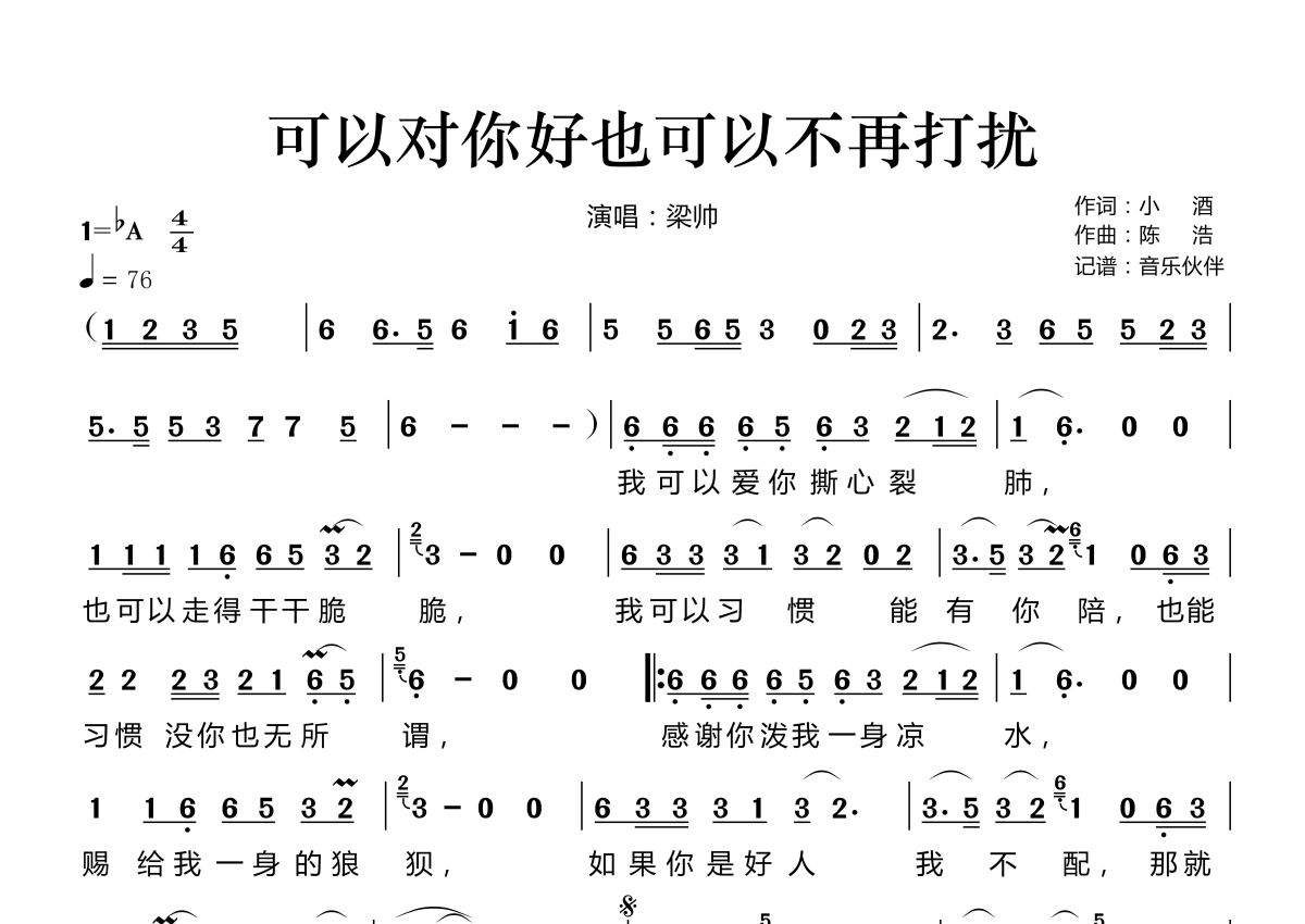 可以对你好也可以不再打扰简谱 - 梁帅演唱