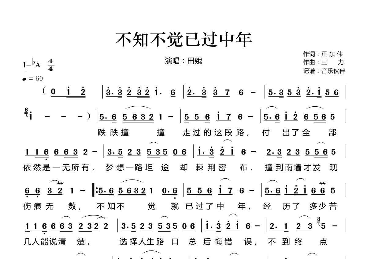 《不知不觉已过中年》是田娥演唱的一首歌曲,拍号为4/4拍,歌曲速度为每分钟60拍,这份简谱共有一张高清图谱,图谱由 @音乐伙伴 编配上传。