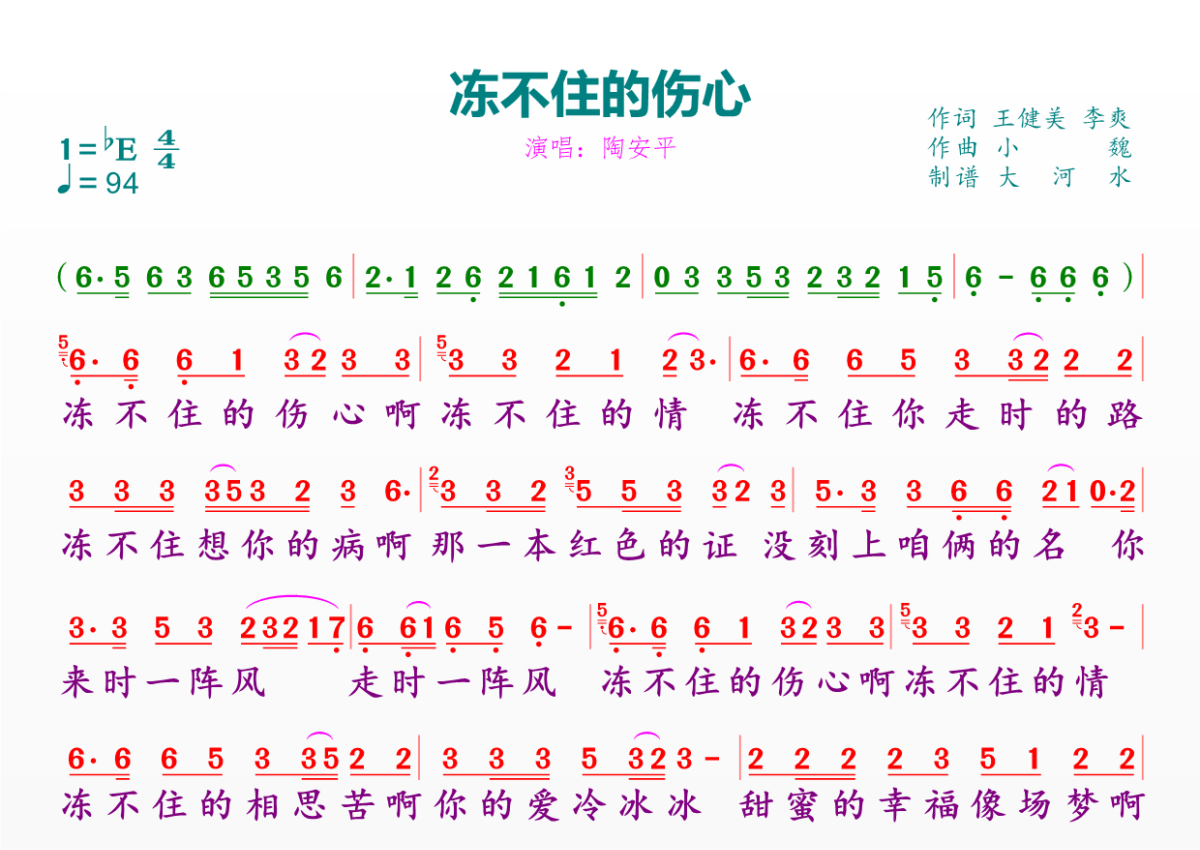 《冻不住的伤心》是陶安平演唱的一首歌曲,拍号为4/4拍,歌曲速度为每分钟94拍,这份简谱共有一张高清图谱,图谱由 @临海雪原 编配上传。