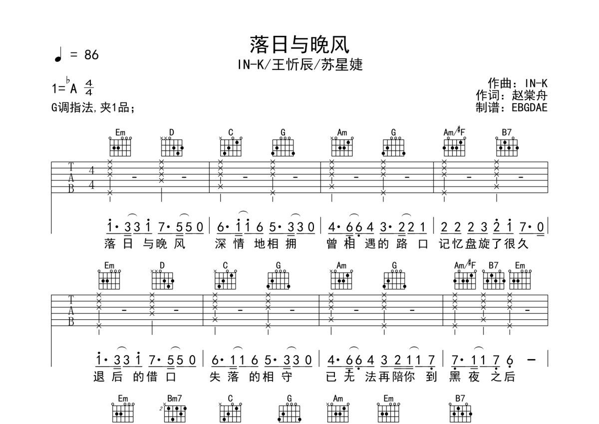 IN-K/王忻辰/苏星婕《落日与晚风》吉他谱 - G调弹唱六线谱