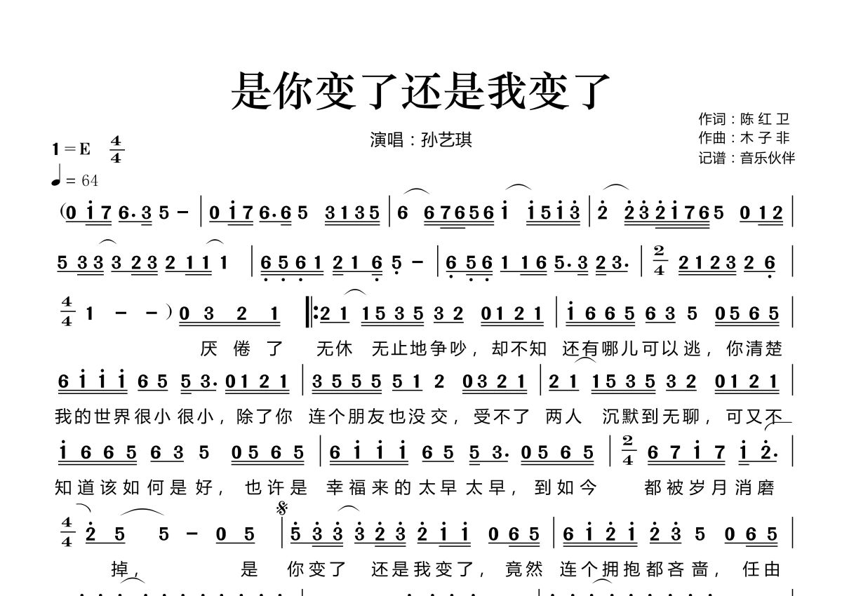 《是你变了还是我变了》是孙艺琪演唱的一首歌曲,拍号为4/4拍,歌曲速度为每分钟64拍,这份简谱共有一张高清图谱,图谱由 @音乐伙伴 编配上传。