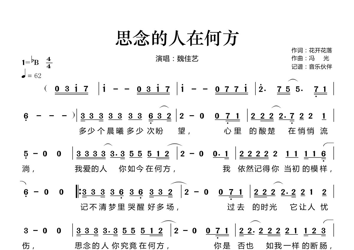 《思念的人在何方》是魏佳艺演唱的一首歌曲,拍号为4/4拍,歌曲速度为每分钟62拍,这份简谱共有一张高清图谱,图谱由 @音乐伙伴 编配上传。