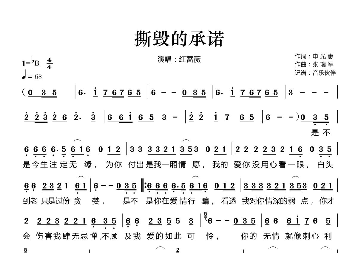 撕毁的承诺简谱 - 红蔷薇演唱