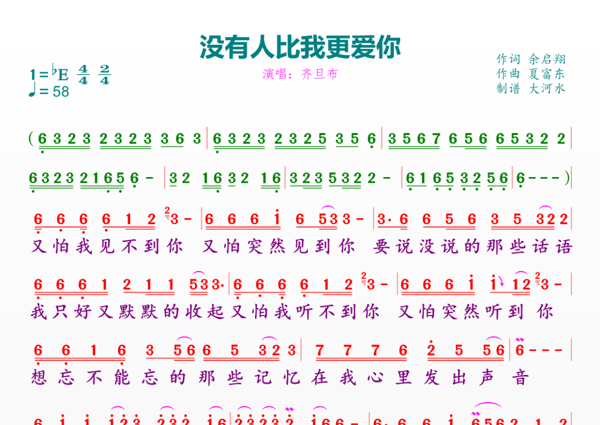 《没有人比我更爱你》是齐旦布演唱的一首歌曲,拍号为4/4拍,歌曲速度为每分钟58拍,这份简谱共有一张高清图谱,图谱由 @临海雪原 编配上传。