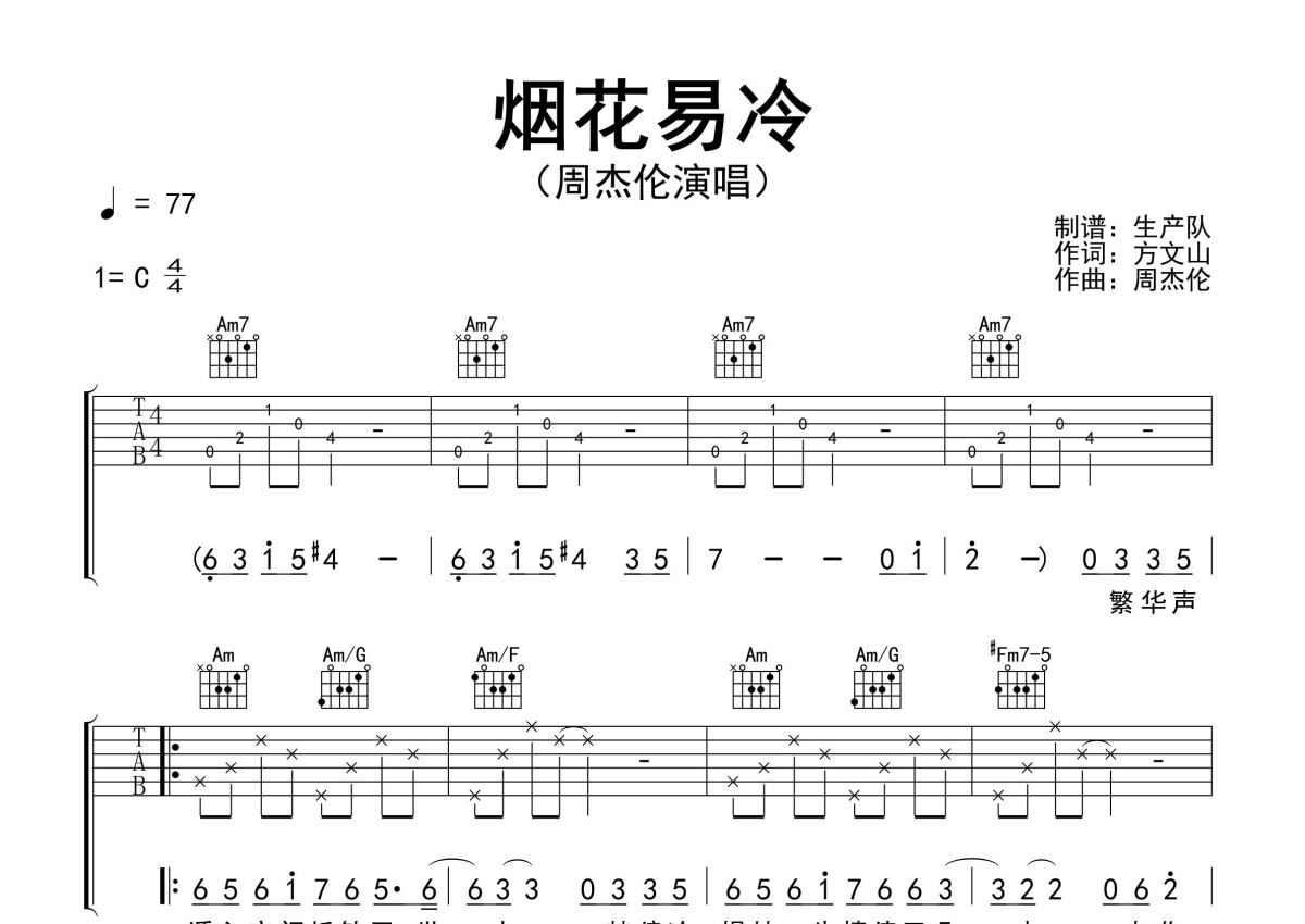 《烟花易冷》是周杰伦演唱的一首歌曲,精编完美版,本吉他谱采用的是C调指法编配,这份吉他谱共有三张高清图谱,图谱由 @生产队 编配上传,图谱使用六线谱编配,包含吉他和弦指法、简谱以及歌词部分,使用这份烟花易冷吉他谱,可以让你更加方便地掌握这首歌曲的弹唱技巧,快来尝试吧。周杰伦演唱的歌曲《烟花易冷》原版吉他谱,含完整的前奏、间奏solo编配,精编完美版,优质推荐!。