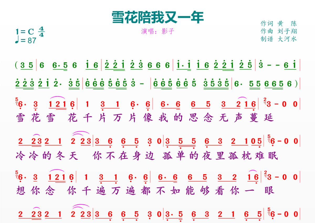 《雪花陪我又一年》是影子演唱的一首歌曲,拍号为4/4拍,歌曲速度为每分钟87拍,这份简谱共有一张高清图谱,图谱由 @临海雪原 编配上传。