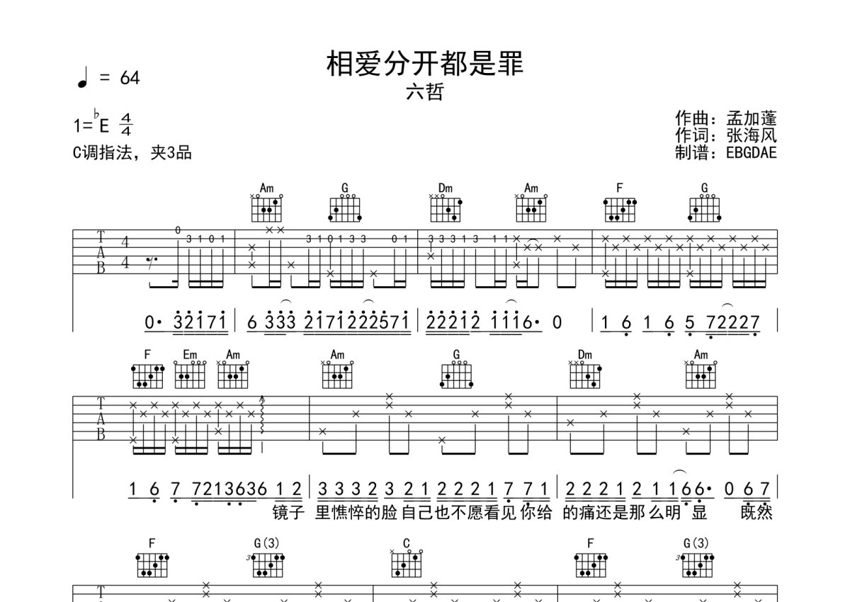 六哲《相爱分开都是罪》吉他谱 - C调弹唱六线谱