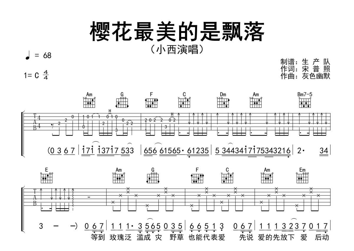 小西《樱花最美的是飘落》吉他谱 - C调弹唱六线谱 - 精编完美版
