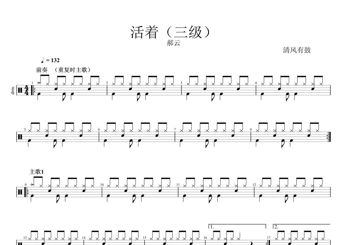 《活着-简化版》是郝云演唱的一首歌曲,拍号为4/4拍,这份架子鼓谱共有三张高清图谱,图谱由 @清风有鼓 编配上传,图谱使用五线谱编配,使用这份活着-简化版架子鼓谱,你将能够轻松地敲打出这首郝云的活着-简化版,快来尝试吧。