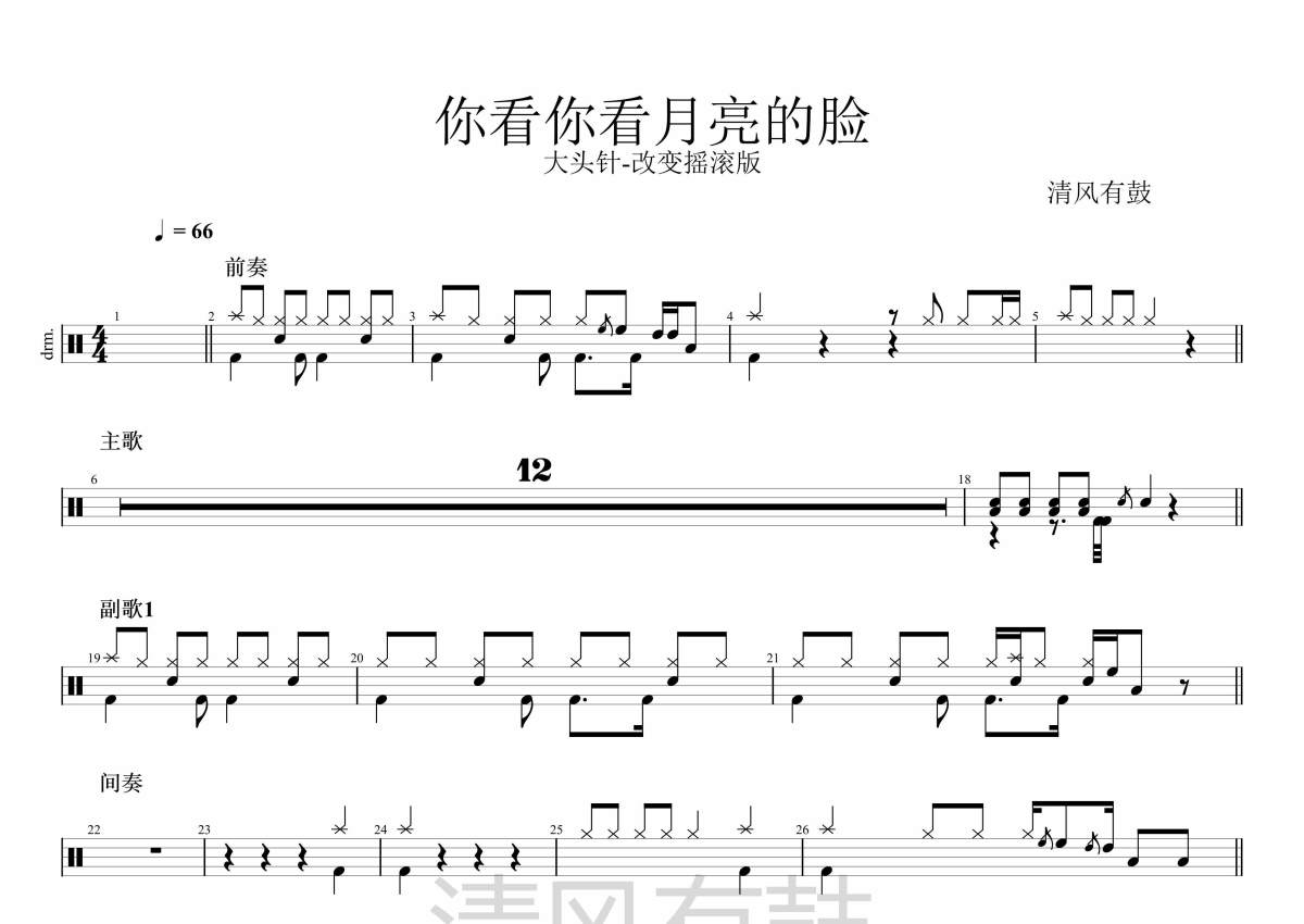 大头针《你看你看月亮的脸 (烟嗓男版)》架子鼓谱