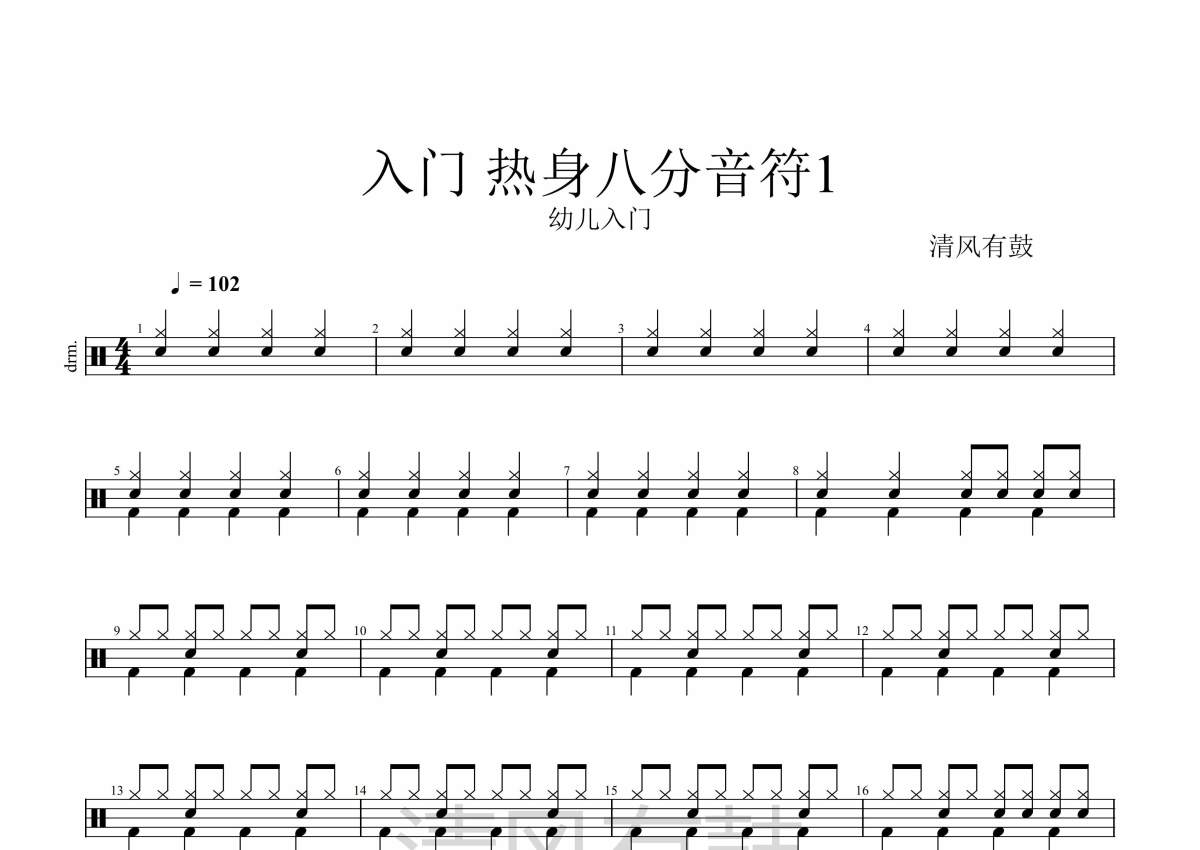 《八分音符练习》是入门演唱的一首歌曲,拍号为4/4拍,这份架子鼓谱共有一张高清图谱,图谱由 @清风有鼓 编配上传,图谱使用五线谱编配,使用这份八分音符练习架子鼓谱,你将能够轻松地敲打出这首入门的八分音符练习,快来尝试吧。